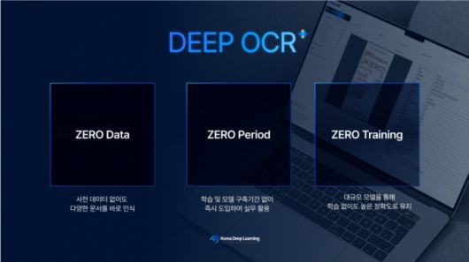 이와 관련, 김 대표는 △제로 라벨링(별도 데이터 수집·라벨링 불필요) △제로 디플로이 타임(모델 구축 시간 최소화) △제로 프리 트레이닝(추가 학습 없이 높은 정확도 보장) 등 '쓰리(3) 제로 OCR'을 슬로건으로 제시했다.