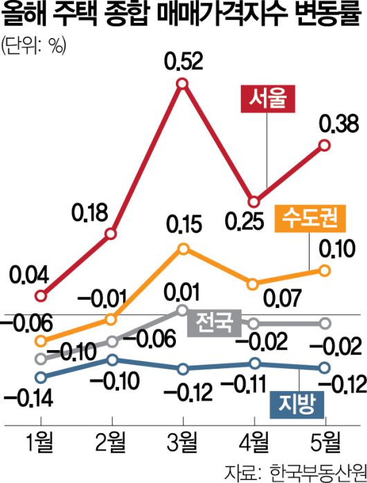 16일 한국부동산원이 발표한 5월 전국 주택가격 동향 조사 결과에 따르면 서울의 주택종합(아파트·연립주택·단독주택 포함) 매매가격은 전월보다 0.38% 올랐다.
