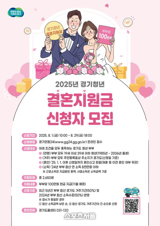 대상자 선정은 부부의 최근 5년간 경기도 거주기간과 지난해 부부 합산 소득수준을 반영해 이뤄지며, 선정 시 오는 11월 경기청년 결혼 지원금 100만 원이 지급된다.