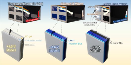 모드 III(변색과 증착 모드)는 은(Ag+)이온이 환원 반응을 통해 전극 표면에 증착돼 빛과 열을 반사하는 동시에 변색 물질이 반사광을 흡수함으로써 외부 보행자의 눈부심까지 효과적으로 차단할 수 있다. 냉방에 효과적이다.