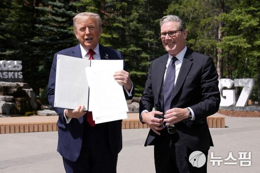 캐나다에서 열리는 주요7개국(G7) 정상회의 참석차 만난 도널드 트럼프 미국 대통령과 키어 스타머 영국 총리는 이날 만나 양국이 지난달에 도달한 무역 합의를 최종 확정했다고 밝혔다.