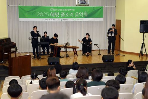 ▲ 태광그룹 일주학술문화재단은 지난 16일 서울 금천구 혜명메이빌(옛 혜명보육원)에서 '일주 오케스트라와 함께하는 2025년 혜명 풀소리 음악회'를 열었다고 17일 밝혔다. 음악회는 일주재단의 음악 전공 장학생들로 구성된 '일주 오케스트라'의 재능 기부로 마련됐다. 김민수 일주학술문화재단 이사장은 "앞으로도 장학생들이 역량을 발휘하고 지역사회와 함께 성장할 수 있도록 다양한 활동을 이어가겠다"고 말했다.