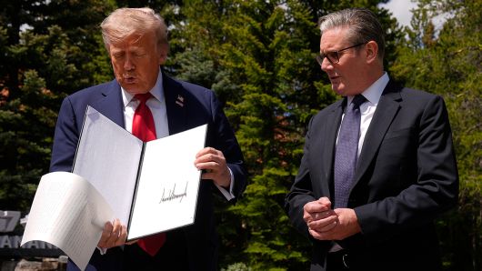 도널드 트럼프 미국 대통령은 16일(현지시간) 캐나다 앨버타주의 휴양도시 캐내내스키스에서 열린 주요 7개국(G7) 정상회의 참석 계기에 키어 스타머 영국 총리와 양자회담을 하고 양국 간 무역협정을 체결했습니다.
