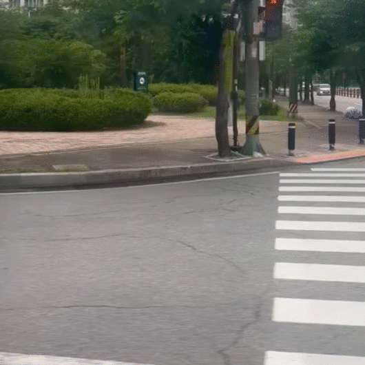 | 차량으로 이동하며 촬영한 횡단보도 근처 시각장애인 점자 블록과 볼라드. 볼라드 전면에 점형 블록은 설치되어 있지 않다. / 영상 = 강윤지 인턴기자 |
