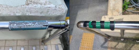 | 부적정하게 설치된 외부 경사로 손잡이 점자 표지판 / 사진=한국시각장애인연합회 제공 |