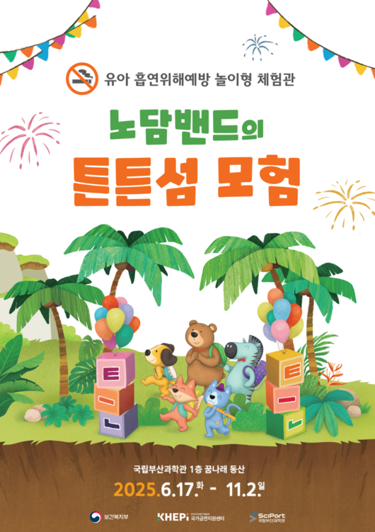 [파이낸셜뉴스] 국립부산과학관(관장 송삼종)은 흡연 예방을 위한 유아 체험전 ‘노담밴드의 튼튼섬 모험’을 17일부터 11월 2일까지 과학관 1층 꿈나래동산에서 무료로 개최한다고 밝혔다.