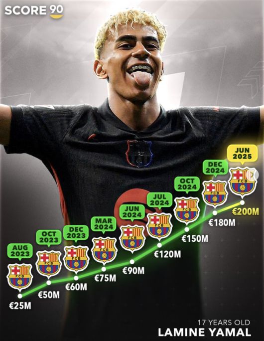 대망의 1위는 야말이었다. 그의 가치는 2억 유로(약 3,143억 원)로 전 세계 축구 선수 중 가장 높았다. 지난해 12월과 비교했을 때 2,000만 유로(약 314억 원)가 상승했다.