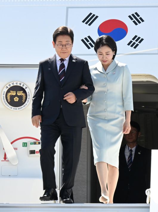 이재명 대통령과 김혜경 여사가 16일 (현지시간) G7 정상회의에 참석하기 위해 캘거리공항에 도착해 트랩을 내려오고 있다. 2025.06.16 캘거리/김호영기자 |