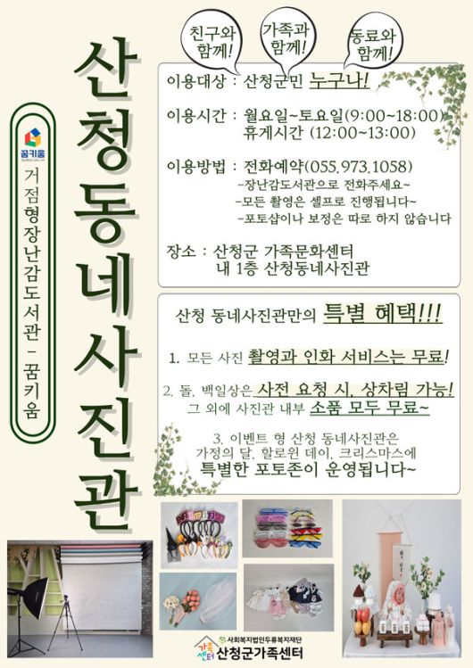 가족문화센터 1층에 위치하고 있는 산청동네사진관은 △사진관 내 다양한 종류의 소품 비치 △무료 셀프촬영 및 인화 사진과 종이 액자 증정 △사전 백일·돌상 세팅 및 관련 의상 무료 대여 등을 지원한다.