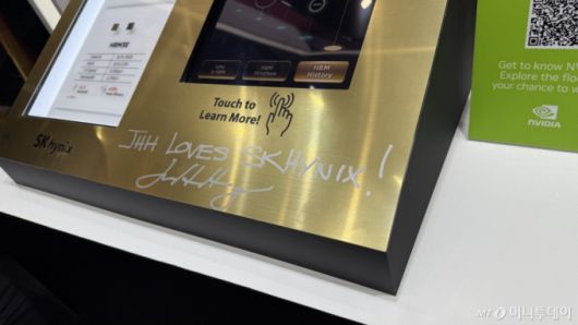 대만 타이베이 난강 전시관에서 20일 개막한 '컴퓨텍스 2025'에서 젠슨 황 엔비디아 CEO가 SK하이닉스 전시관을 찾아 'JHH LOVES SK Hynix!(젠슨황은 SK하이닉스를 사랑해!)'라는 문구를 남겼다. /사진=김남이 기자 |