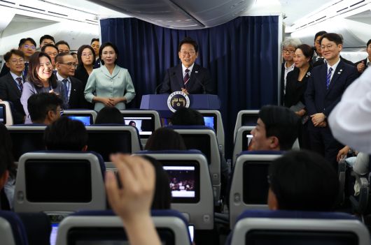 이재명 대통령이 16일 G7 정상회의 참석을 위해 캐나다 캘거리로 향하는 공군 1호기 기내에서 기자간담회를 하고 있다. 남정탁 기자 jungtak2@segye.com ⓒ 세상을 보는 눈, 세계일보