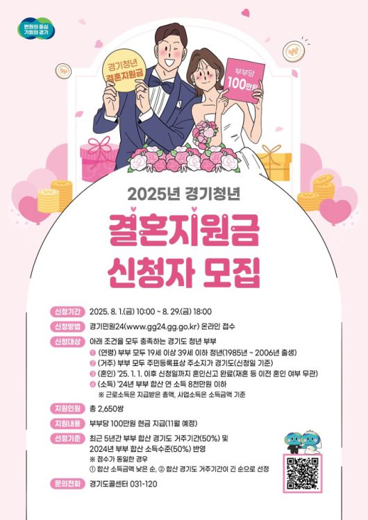 대상자 선정은 부부의 최근 5년간 경기도 거주기간과 지난해 부부 합산 소득수준을 반영해 이뤄지며, 선정 시 오는 11월 경기청년 결혼 지원금 100만 원이 지급될 계획이다.