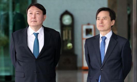 지난 2017년 10월 23일 조은석 당시 서울고검장(오른쪽)과 윤석열 서울중앙지검장이 서울고검에서 열린 국회 법사위 국정감사에 앞서 국감장에 도착하는 의원들을 기다리는 모습. 뉴스1 |