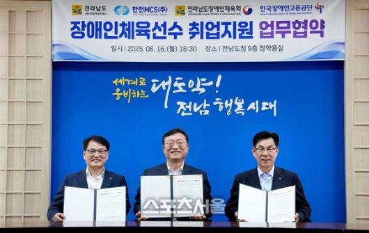 [스포츠서울┃조광태기자] 전라남도는 지난 16일 도청 정약용실에서 한전MCS(주)와 장애인 체육선수 취업 지원 업무협약을 하고, 연내 30명 내외 신규 채용 등 장애인 고용증진을 위한 상호 협력을 다짐했다.