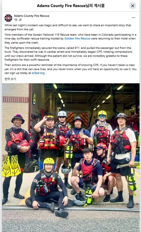 미국 현지 소방당국인 콜로라도주 아담스 카운티 소방서는 페이스북 계정을 통해 “한국 구조대원들의 구조 행동은 모든 소방관이 따라야 할 교과서 같은 대응이었다”며 “즉각적인 CPR과 현장 통제로 신속한 구조 활동을 할 수 있었다”고 밝혔다.