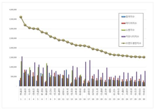 4위, 이병헌 브랜드는 참여지수 507,119 미디어지수 735,097 소통지수 530,379 커뮤니티지수 1,247,603이 되면서 브랜드평판지수 3,020,198로 분석됐다.