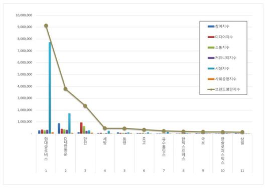 5위, 동방 브랜드는 참여지수 107,528 미디어지수 60,695 소통지수 59,599 커뮤니티지수 72,583 시장지수 105,550 사회공헌지수 48,909가 되면서 브랜드평판지수 454,863으로 분석됐다. 지난 5월 브랜드평판지수 497,614와 비교해보면 8.59% 하락했다.