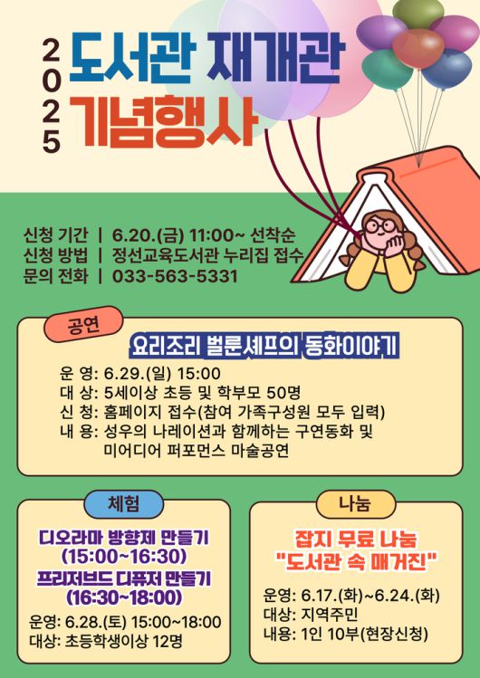 자세한 사항은 정선교육도서관 누리집(https://lib.gwe.go.kr/jslib/index.do) 및 종합자료실(☎ 033-563-5331)로 문의하면 된다.