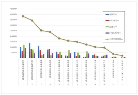 3위, 현대해상 자동차보험 브랜드는 참여지수 1,124,752 미디어지수 747,463 소통지수 297,384 커뮤니티지수 371,276이 되면서 브랜드평판지수 2,540,875로 분석됐다. 지난 5월 브랜드평판지수 3,246,466과 비교해보면 21.73% 하락했다.