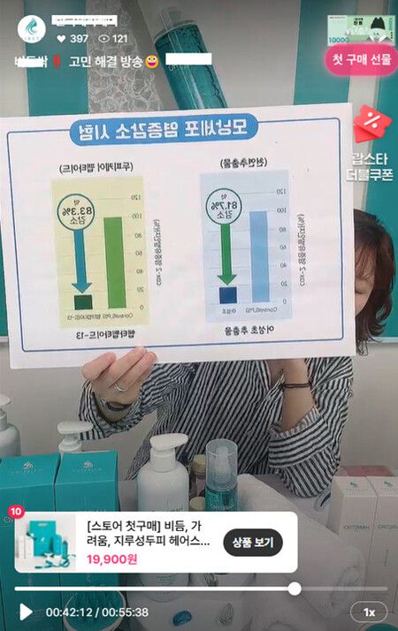 ‘모발을 자라게 하는’ 등의 표현으로 화장품이 의약품의 효능·효과가 있는 것으로 오인하게 하는 라이브커머스 방송 광고. 식품의약품안전처 제공 |