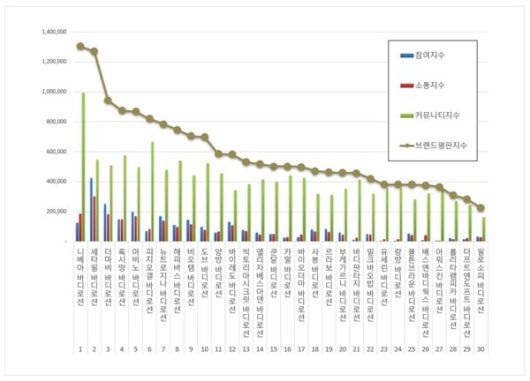 브랜드에 대한 평판은 브랜드에 대한 소비자들의 활동 빅데이터를 참여가치, 소통가치, 소셜가치, 시장가치, 재무가치로 나누게 된다. 바디로션 브랜드평판지수는 참여지수, 소통지수, 커뮤니티지수로 분석했다.