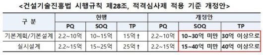 기본계획/기본설계는 SOQ 구간이 '10억~15억원'에서 '10억~30억원 미만'으로, TP는 '15억원 이상'에서 '30억원 이상'으로 바뀐다. 실시설계는 SOQ의 경우 '15억~25억원'에서 '15억~40억원 미만'으로, TP는 '25억원 이상'에서 '40억원 이상'으로 높아진다.