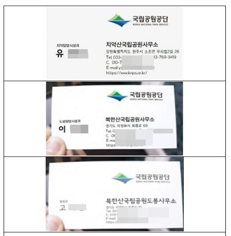 국립공원공단 명의 도용 사기범 명함. [사진 =국립공원 월악산 사무소] 2025.06.17 baek3413@newspim.com |