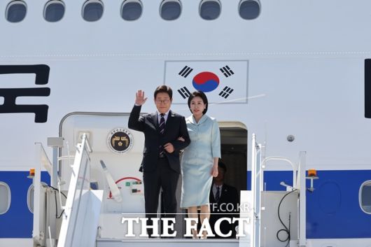 이재명 대통령이 16일(현지시간) 캐나다 앨버타주 캘거리국제공항에 도착해 김혜경 여사와 공군 1호기에서 내리며 인사를 하고 있다. /뉴시스 |