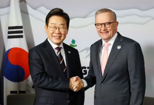 이재명 대통령과 앤서니 앨버니지 호주 총리가 16일(현지시간) 캐나다 앨버타주 캘거리의 한 호텔에서 만나 악수하고 있다. 대통령실사진기자단 |