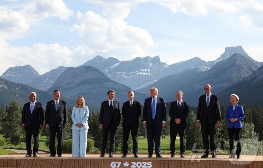 (앨버타 로이터=뉴스1) 류정민 특파원 = 16일(현지시간) 캐나다 앨버타주 휴양 도시 캐내내스키스에서 열린 주요 7개국(G7) 정상회의에 참석한 정상들이 단체 기념사진을 촬영하고 있다. 사진 왼쪽부터 안토니우 코스타 유럽연합(EU) 정상회의 상임의장, 이시바 시게루 일본 총리, 조르자 멜로니 이탈리아 총리, 에마뉘엘 마크롱 프랑스 대통령, 마크 카니 캐나다 총리, 도널드 트럼프 미국 대통령, 키이어 스타머 영국 총리, 프리드리히 메르츠 독일 총리, 우르줄라 폰데어라이엔 EU 집행위원장. 2025.06.16 ⓒ 로이터=뉴스1