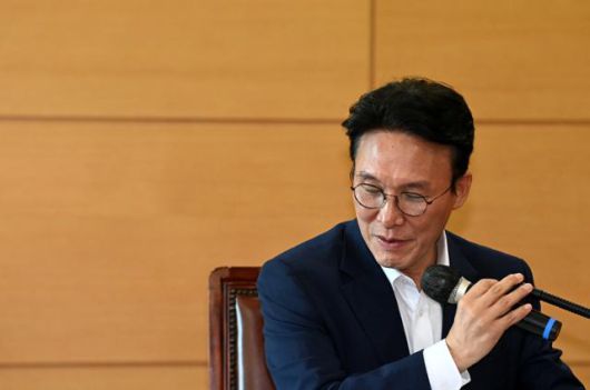 김민석 국무총리 후보자가 17일 서울 종로구 통의동 금융감독연수원에 마련된 청문회 준비단 사무실에서 열린 사회분야 부처 업무보고에 참석하고 있다. 홍인기 기자 |