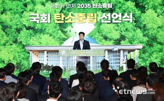 2035년까지 탄소중립 국회를 실현하기 위한 구체적인 실행계획을 공유하는 '국회 탄소중립 선언식'이 17일 서울 여의도 국회 중앙홀에서 열렸다. 김용태 국민의힘 비상대책위원장이 축사를 하고 있다. 이동근기자 foto@etnews.com [Copyright © 전자신문. 무단전재-재배포금지]