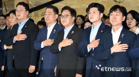 2035년까지 탄소중립 국회를 실현하기 위한 구체적인 실행계획을 공유하는 '국회 탄소중립 선언식'이 17일 서울 여의도 국회 중앙홀에서 열렸다. 김병기 더불어민주당 대표 권한대행(왼쪽 세 번째부터)과 우원식 국회의장, 김용태 국민의힘 비상대책위원장 등 참석자들이 국민의례를 하고 있다. 이동근기자 foto@etnews.com [Copyright © 전자신문. 무단전재-재배포금지]