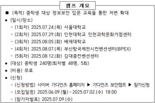 인공지능(AI) 시대를 선도할 중학생을 대상으로 개최하는 '사이버 가디언즈 보안 캠프'는 2017년부터 시작하여 올해로 9회차를 맞이하였으며, 중학생들이 평소 접하기 어려운 정보보안 분야에 쉽게 입문할 수 있도록 흥미와 관심을 유도하는 교육 과정이 제공된다.