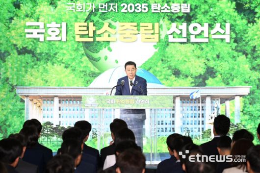 2035년까지 탄소중립 국회를 실현하기 위한 구체적인 실행계획을 공유하는 '국회 탄소중립 선언식'이 17일 서울 여의도 국회 중앙홀에서 열렸다. 김병기 더불어민주당 대표 권한대행이 축사를 하고 있다. 이동근기자 foto@etnews.com [Copyright © 전자신문. 무단전재-재배포금지]