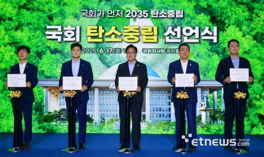 2035년까지 탄소중립 국회를 실현하기 위한 구체적인 실행계획을 공유하는 '국회 탄소중립 선언식'이 17일 서울 여의도 국회 중앙홀에서 열렸다. 우원식 국회의장과 여야 대표 등 내빈들이 국회 탄소중립 비전 퍼포먼스를 하고 있다. 왼쪽부터 한창민 사회민주당 대표, 김용태 국민의힘 비상대책위원장, 우 의장, 김병기 더불어민주당 대표 권한대행, 천하람 개혁신당 대표.