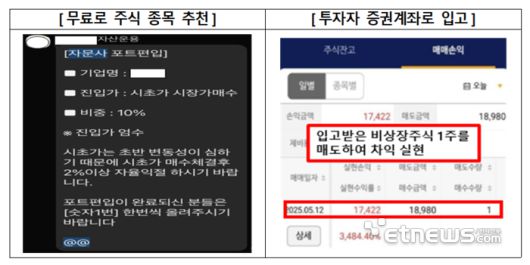 실제 불법업체는 비상장사 A회사의 주식을 저가로 매집해 A사와 상호가 유사하지만, 실체가 없는 A생명과학의 허위 홈페이지를 개설해 허위 홍보성 글을 대량으로 배포했다. 카톡, SNS 등으로 “A생명과학의 상장임박”과 “상장실패시 재매입 약정체결” 등을 미끼로 주식매수를 유도하는 동시에 매수신청자에는 A사의 주식을 선입고하는 방식으로 유인한다.