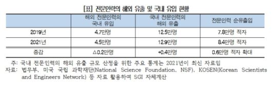 SGI는 전문 인력의 해외유출 및 국내유입 현황과 관련해 "2019년 12만5000명이던 해외 유출 전문 인력은 이용 가능한 가장 최신 자료인 2021년에 12만9000명으로 4000명 증가한 반면, 같은 기간 국내로 유입된 외국인 전문 인력은 4만7000명에서 4만5000명으로 감소했다"며 "이에 따라 두뇌수지 적자도 2019년 7만8000명에서 2021년 8만4000명으로 확대됐다"고 설명했다.