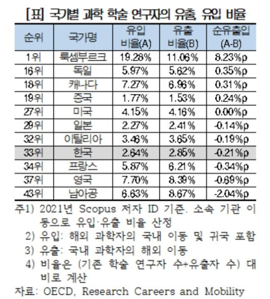 또한 보고서는 과학 학술 연구자의 국경 간 이동 데이터를 바탕으로 한국이 순유출국임을 지적했다.