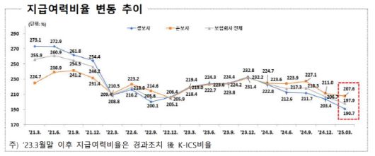 생명보험사는 전 분기 대비 12.7%포인트 하락한 190.7%로 집계됐고, 손해보험사는 3.4%포인트 내린 207.6%로 나타났다.