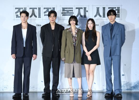 17일 서울 광진구 롯데시네마 건대입구점에서 진행된 영화 ‘전지적 독자 시점’ 제작발표회에서 출연 배우들이 취재진을 향해 포즈를 취하고 있다. 왼쪽부터 신승호, 이민호, 나나, 채수빈, 안효섭.
