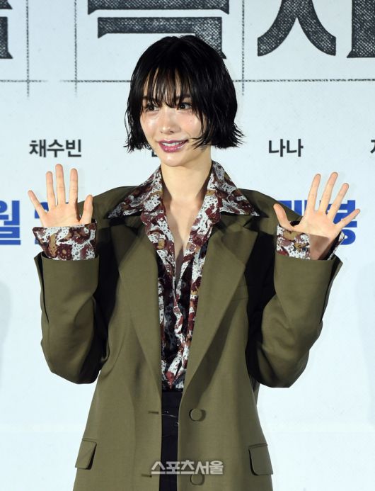 배우 나나가 17일 서울 광진구 롯데시네마 건대입구점에서 진행된 영화 ‘전지적 독자 시점’ 제작발표회에서 취재진을 향해 포즈를 취하고 있다.