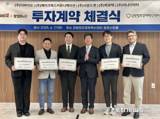 강원창조경제혁신센터(대표 이해정)가 17일 중소벤처기업부 창업-BuS(Build up Strategy for Startups) 프로그램을 통해 발굴한 유망 스타트업 5개사와 투자계약을 체결했다.