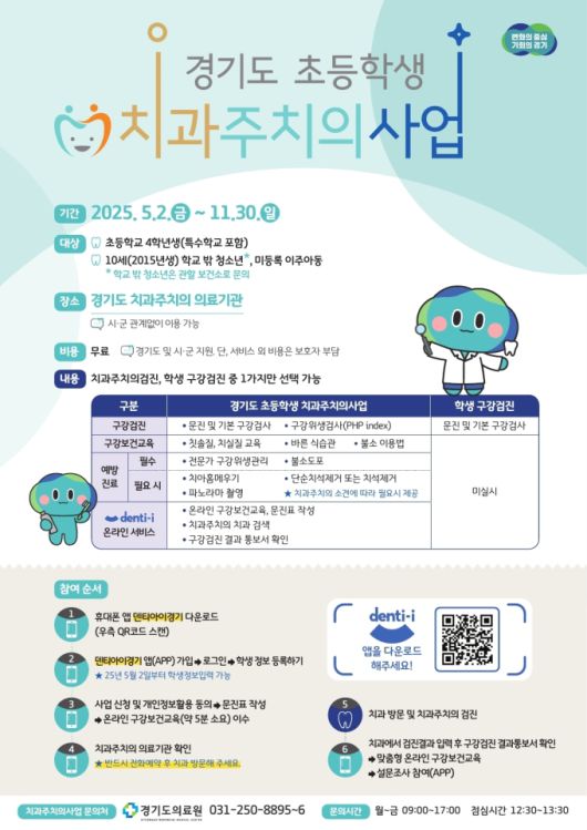 지원대상은 관내 초등학교 4학년(특수학교 포함)과 2015년에 출생한 학교 밖 청소년이며, 치과 주치의 검진 또는 학생 구강 검진을 무료로 제공한다.