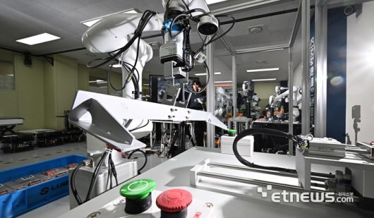 국내 연구진이 다양한 제조업 작업 공정에 로봇을 쉽게 적용할 수 있게 하는 작업 인공지능(AI) 기술을 세계 최초로 개발했다. 대규모 언어모델(LLM)과 가상환경에 기반한 '로봇 작업 AI기술'은 사용자의 명령을 이해하고 로봇 작업 명령을 자동 생성·실행하는 기술이다. 16일 대전 유성구 한국기계연구원에서 연구원이 로봇 작업 AI 기술을 시연하고 있다. 대전=이동근기자 foto@etnews.com |