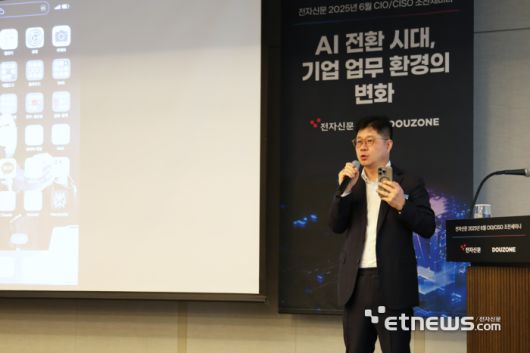 지용구 더존비즈온 부사장(성장전략부문 대표)는 17일 그랜드 인터컨티넨탈 서울 파르나스에서 'AI 전환 시대, 기업 업무 환경의 변화'를 주제로 열린 '전자신문 6월 CIO·CISO 세미나'에서 “모든 일을 AI가 할 수는 없다는 판단 하에 AI 에이전트가 작업의 95%를 수행하고 5%는 사람이 맡아야 한다”며 이같이 밝혔다.