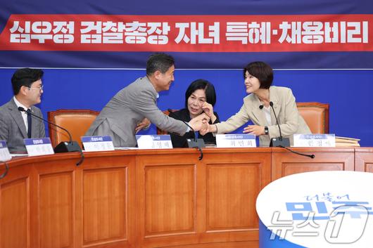 (서울=뉴스1) 안은나 기자 = 17일 서울 여의도 국회에서 열린 더불어민주당 심우정 검찰총장 자녀 특혜채용비리 진상조사단 공개회의에서 한정애 단장(오른쪽)과 김영배 의원이 악수하고 있다. 2025.6.17/뉴스1coinlocker@news1.krCopyright ⓒ 뉴스1. All rights reserved. 무단 전재 및 재배포, AI학습 이용 금지.