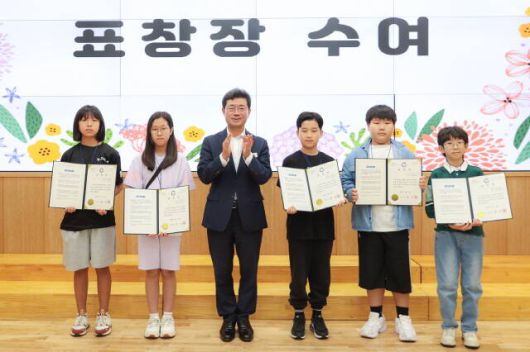 정인화 광양시장이 2025 장한 청소년 초청행사에서 표창을 수여하고 초등학생들과 기념 촬영을 하고 있다./광양시 |