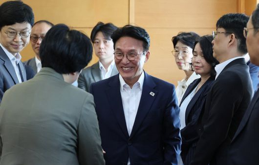 | 김민석 국무총리 후보자가 17일 서울 종로구 통의동 금융감독연수원에 마련된 청문회 준비단 사무실에서 열린 사회분야 부처 업무보고에 참석하며 인사를 나누고 있다. / 사진 = 연합뉴스 |