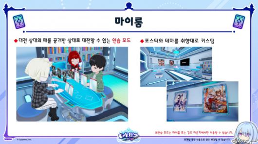 나만의 공간인 마이룸에서는 다른 플레이어를 초대해 대전하거나 취향에 따라 마이룸의 테마를 바꾸며 즐길 수 있다. 좋아하는 카드 일러스트를 장식할 수 있는 포스터 기능도 있어, 전작 ‘섀도우버스’와의 연동 특전으로 받은 리더스킨 캐릭터 일러스트의 포스터를 장식할 수도 있다.